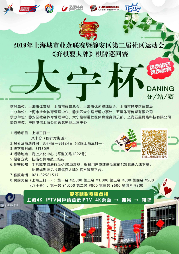 2019年上海城市业余联赛暨静安区第二届社区运动会《弈棋耍大牌》棋牌巡回赛第一站“大宁杯”分站赛即将拉开帷幕。